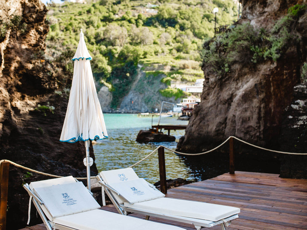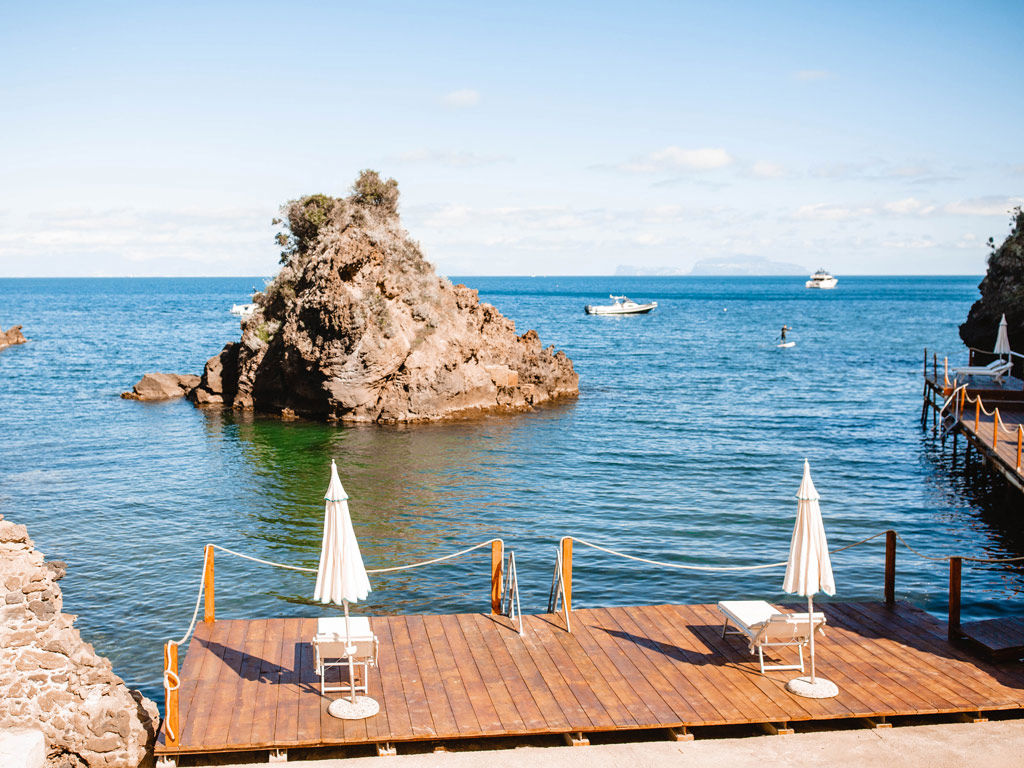 Le piattaforme, una in legno e l'altra in cemento, sono adagiate sugli scogli di Sant’Anna. La piattaforma in legno ospita sdraio e ombrelloni ben distanziati, in modo da garantire la giusta privacy. C’è anche una piccola area con fondale basso, perfetta per chi viaggia con bambini. Mentre chi ama tuffarsi nel blu può raggiungere il grande solarium panoramico, collegato all’acqua da una comoda scaletta.
